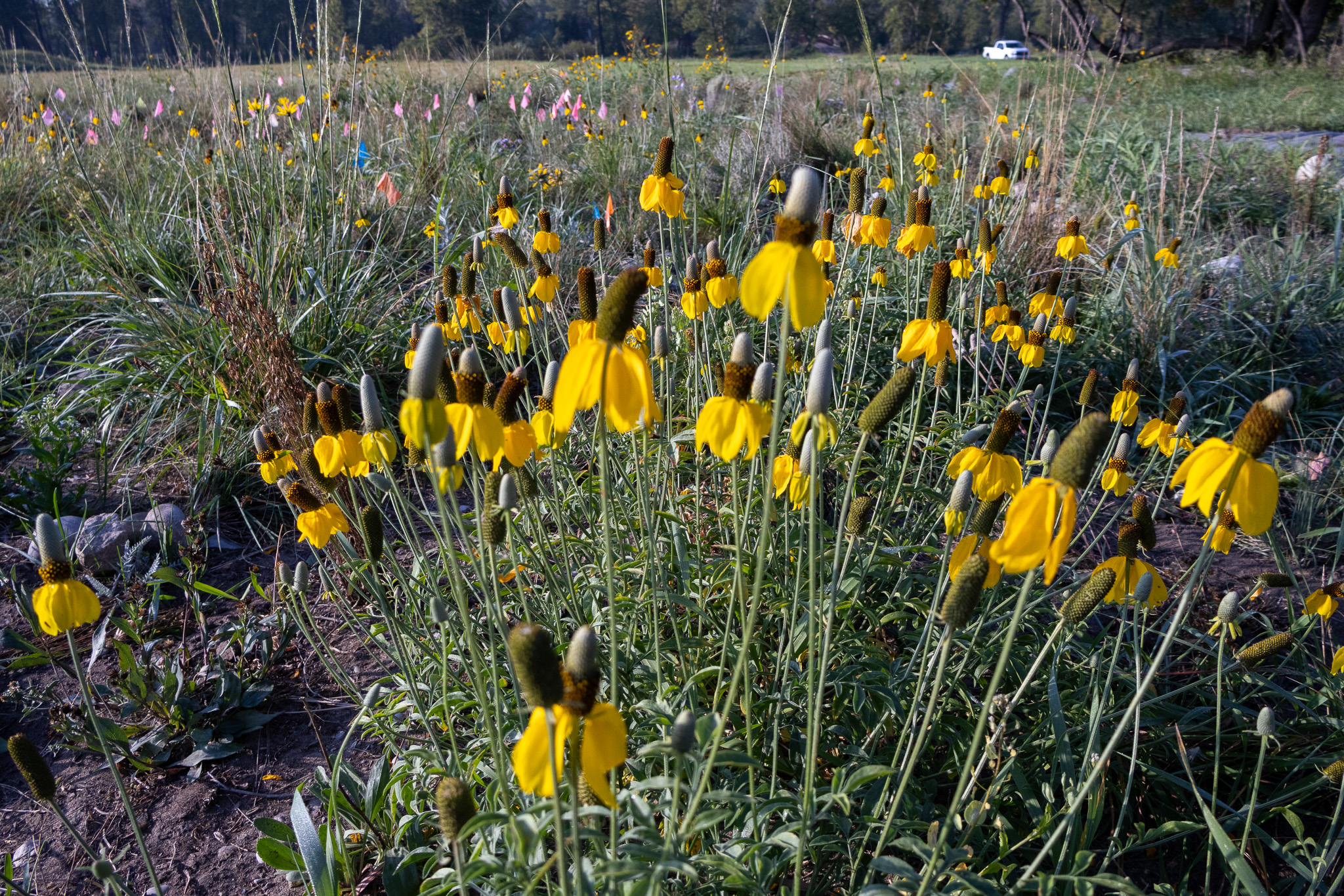 Prairie coneflower is often bright yellow (pictured), but has a natural red colored variant. Prairie coneflower seed germinates really well, and the flowers usually produce seed in the first season. The plant often has many branches, and the leaves are highly divided. Prairie coneflower can easily grow from 30-60+ cm, depending on moisture conditions. Its native range is predominantly to the east and south of Calgary, however we include this species in our grassland restoration sites in the Bow Valley Ranch (pictured above) as it is a very dry tolerant species that can grow in a future Fish Creek with migrating climate zones associated with global warming
